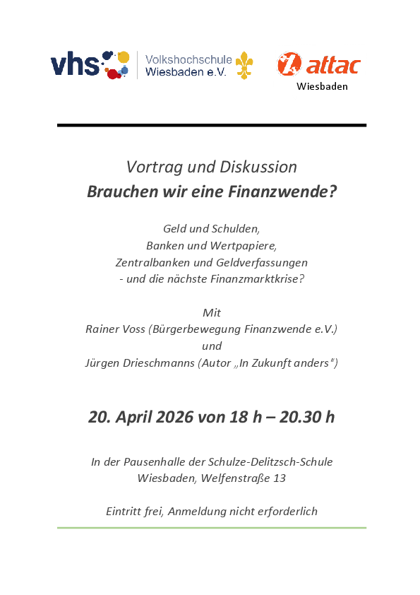 Unabhängig vom Kurs wird es am 20.04.26 einen Vortrag zum Thema von Investmentbanker Rainer Voss von der Bürgerbewegung Finanzwende geben, der kostenfrei in der Pausenhalle der Schultze-Delitzsch-Schule stattfindet und von Attac Wiesbaden mitorganisiert wird.